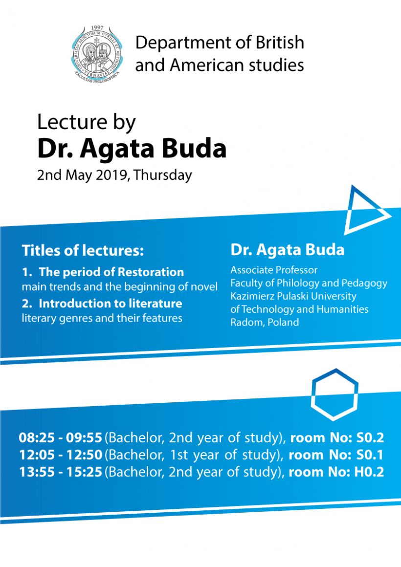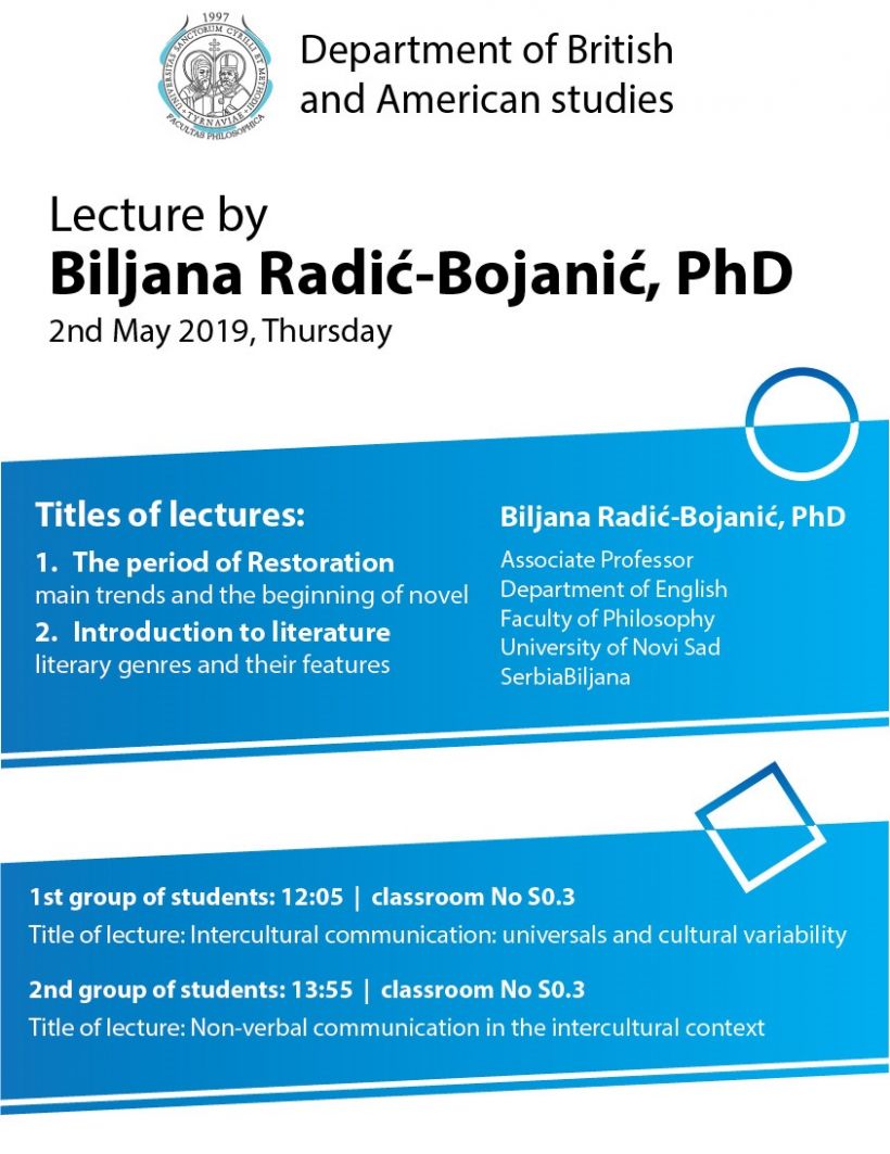 2.5.2019Katedra anglistiky a amerikanistiky pozýva na prednášky dr. Agaty Buda z Poľska a Biljany Radić-Bojanić, PhD. zo Srbska, ktoré sa uskutočnia dňa 02. 05. 2019.