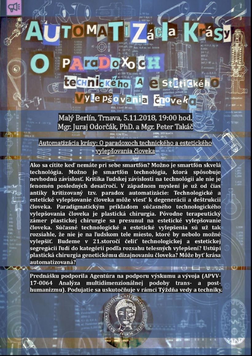 Katedra filozofie a aplikovanej filozofie FF UCM pozýva na prednášku Automatizácia krásy: O paradoxoch technického a estetického vylepšovania človeka, ktorú prednesú Mgr. Juraj Odorčák, PhD. a Mgr. Peter Takáč. Miesto a čas konania: Malý Berlín, Trnava, 5. 11. 2018, 19.00 hod. Prednáška sa uskutoční v rámci Týždňa vedy a techniky 2018.