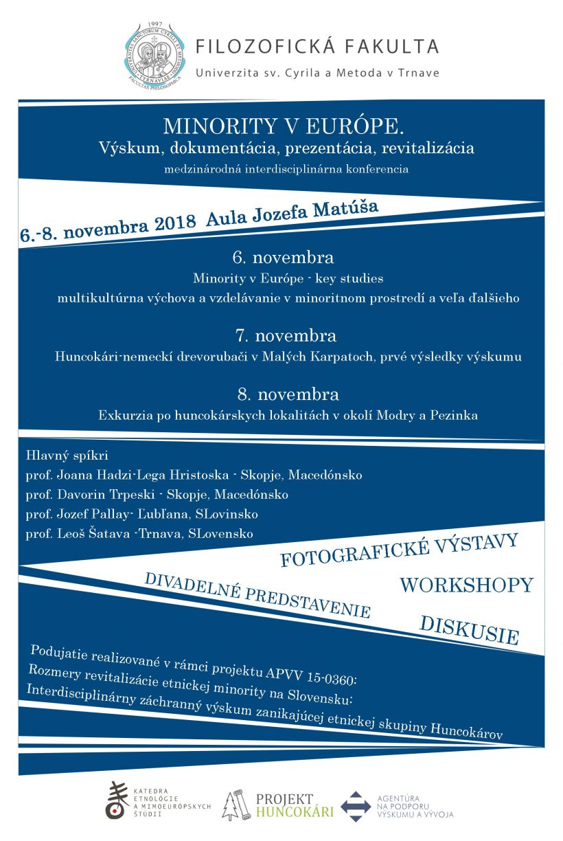 6.11.2018 - 8.11.2018Katedra etnológie a mimeurópskych štúdií FF UCM pozýva na medzinárodnú interdisciplinárnu konferenciu Minority v Európe, ktorá sa uskutoční 6. - 8. 11. 2018 v Aule Jozefa Matúša UCM.