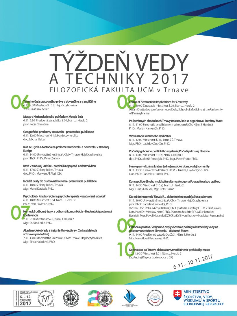 Ani tento rok nechýbali na našom Týždni vedy a techniky 2017 rozmanité prednášky populárneho, ale aj vedeckého charakteru. Diskutovali sme na rôzne témy o histórii, stredoveku a novoveku, Indii, Mexiku či arabskej kultúre. Pochutili sme si na tradičnom arabskom čaji a káve. Prešli sme sa po literárnych chodníkoch Trnavy a polemizovali o terminológii pracovného práva v slovenčine a v angličtine.