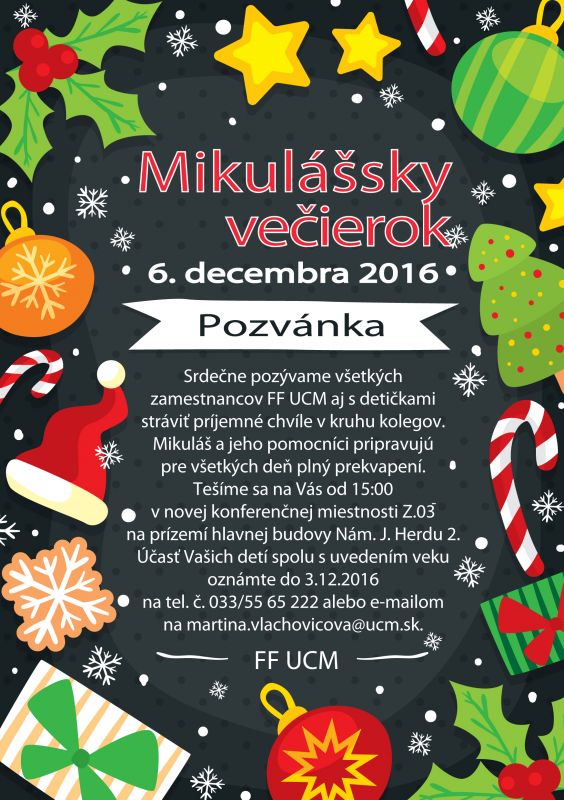 Dňa 6. 12. 2016 sa konal Mikulášsky večierok Filozofickej fakulty UCM v Trnave. Prišlo veľa detí, ktoré sa tešili na kopec zábavy a darčekov. Mikuláša sprevádzali aj dvaja čerti a dvaja anjeli. Na začiatok deti pomohli Mikulášovi zázračne rozsvietiť vianočný stromček. Potom si Mikuláš vypočul zopár krásnych básničiek, ktoré mu deti s radosťou odrecitovali. Nechýbala ani tanečná zábava, ktorú čert rozprúdil svojím hraním na klávesoch. Na záver sme si spoločne pozreli vianočnú rozprávku - Shrekoledu a po nej zazvonil zvoniec a večierka bol koniec.