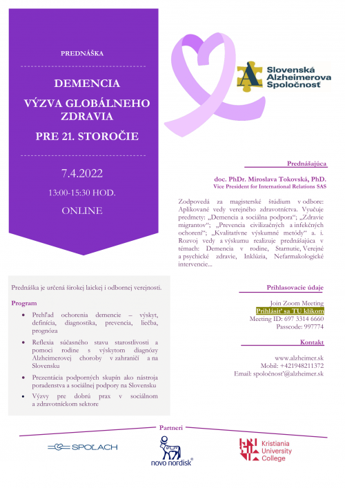 Dňa 07.04.2022 od 13:00 do 15:30 hod. sa uskutoční online prednáška na tému: Demencia - výzva globálneho zdravia pre 21. storočie.
