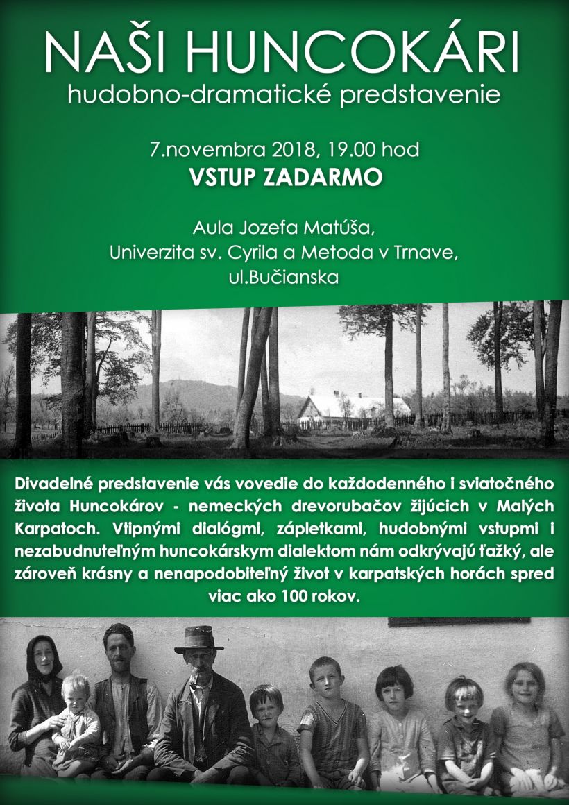 7.11.2018Filozofická fakulta UCM pozýva na hudobno-dramatické predstavenie Naši Huncokári, ktoré sa uskutoční 7. 11. 2018 o 19.00 hod. v priestoroch Auly Jozefa Matúša na Bučianskej ulici. Vstup zadarmo.