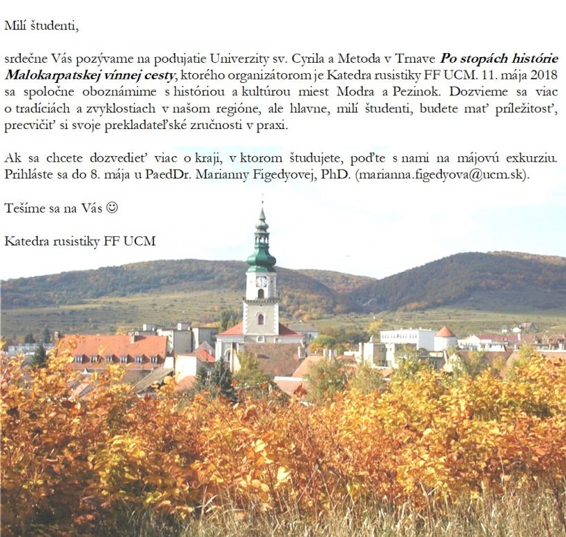 11.5.2018Katedra rusistiky FF UCM srdečne pozýva všetkých študentov na exkurziu Po stopách histórie Malokarpatskej vínnej cesty, ktorá sa uskutoční 11. mája 2018.