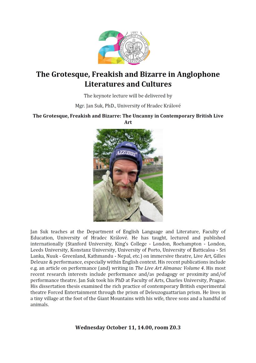 Konferencia je tematicky zameraná na zobrazenie zvláštneho, groteskného a bizarného v literatúrach a kultúrach anglofónnych krajín. Plenárny príspevok s názvom „The Grotesque, Freakish and Bizarre: The Uncanny in Contemporary British Live Art” prednesie Mgr. Jan Suk, PhD. (Univerzita Hradec Králové), popredný odborník na súčasné britské divadlo.