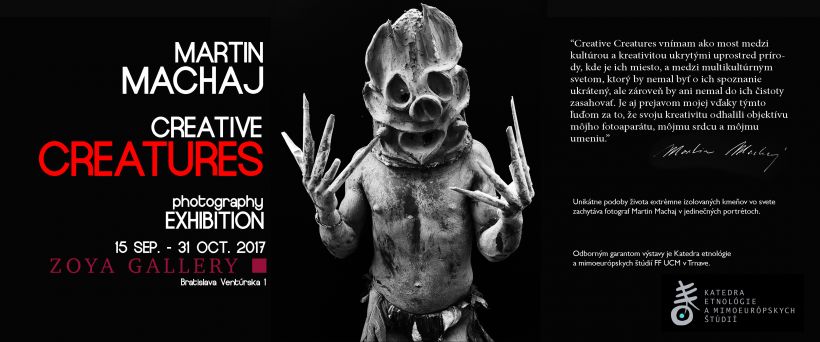 Srdečne Vás pozývame na výstavu Creative Creatures do Zoya Gallery (Bratislava) od 15. 9. 2017 do 31. 10. 2017. Unikátne podoby života extrémne izolovaných kmeňov vo svete zachytáva fotograf Martin Machaj v jedinečných portrétoch. Ďakujeme za príležitosť spolupracovať na tomto skvelom projekte s uznávaným fotografom.