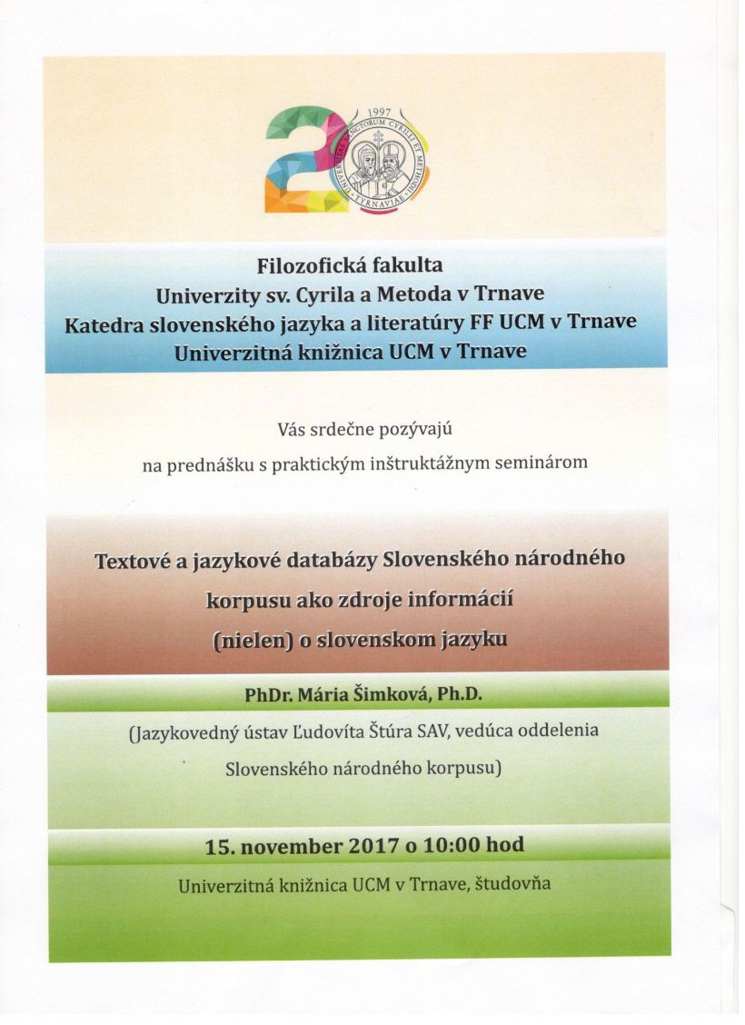 Filozofická fakulta UCM v Trnave, Katedra slovenského jazyka a literatúry FF UCM v Trnave a Univerzitná knižnica UCM v Trnave pozývajú všetkých záujemcov do Univerzitnej knižnice UCM v Trnave, kde sa bude dňa 15. novembra 2017 o 10.00 hod. konať prednáška s praktickým inštruktážnym seminárom Textové a jazykové databázy Slovenského národného korpusu ako zdroje informácií (nielen) o slovenskom jazyku. Prednáša: PhDr. Mária Šimková, Ph.D. (Jazykovedný ústav Ľudovíta Štúra SAV, vedúca oddelenia Slovenského národného korpusu).