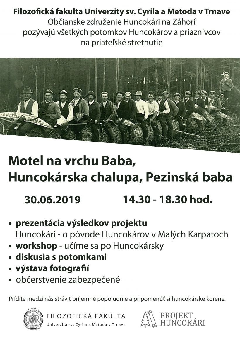 30.6.2019Filozofická fakulta UCM a Občianske združenie Huncokári na Záhorí pozývajú všetkých potomkov Huncokárov a priaznivcov na priateľské stretnutie, ktoré sa uskutoční dňa 30. 06. 2019 o 14.30 hod.