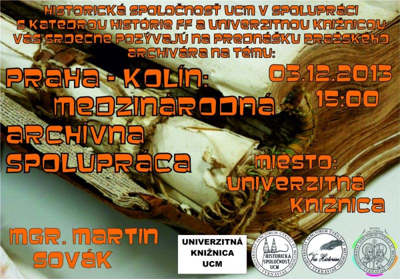 Historická spoločnosť UCM v spolupráci s Katedrou histórie FF a Univerzitnou knižnicou UCM Vás pozývajú na prednášku „Praha - Kolín: Medzinárodná archívna spolupráca“ s Mgr. Martinom Sovákom, ktorá sa uskutoční dňa 3. decembra 2013 /utorok/ o 15.00 hod. v priestoroch Univerzitnej knižnice UCM.