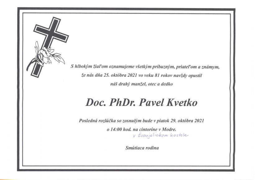 S hlbokým žiaľom oznamujeme všetkým príbuzným, priateľom a známym, že nás dňa 25. októbra 2021 vo veku 81 rokov navždy opustil náš dlhoročný kolega, učiteľ a vzor doc. PhDr. Pavel Kvetko, CSc., min. prof.