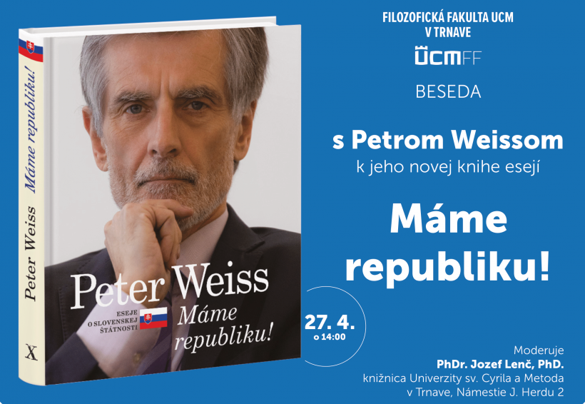 Dňa 27.04.2023 sa v univerzitnej knižnici UCM v Trnave na Námesti J. Herdu 2 uskutoční beseda s Petrom Weissom k jeho novej knihe esejí "Máme republiku!".