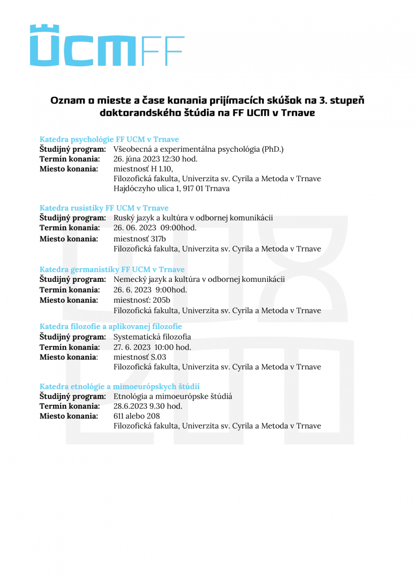 Oznam o mieste a čase konania prijímacích skúšok na 3. stupeň doktorandského štúdia na FF UCM v Trnave - aktualizované