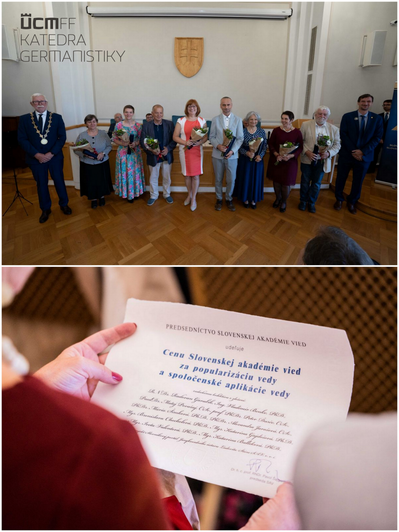 Dňa 4. septembra 2023 sa v Kongresovom centre SAV v Smoleniciach konalo slávnostné podujatie odovzdávania cien Slovenskej akadémie vied. Predseda SAV prof. RNDr. Pavol Šajgalík, DrSc. hneď v úvode pripomenul, že tieto ceny sú najstarším ocenením vedeckej práce na Slovensku a zároveň zdôraznil, že patria medzi najprestížnejšie ocenenia za výsledky vedeckovýskumnej práce či popularizáciu vedy. Jednou z cien, Cenou Slovenskej akadémie vied za popularizáciu vedy a spoločenské aplikácie vedy, bol ocenený aj prof. Peter Ďurčo, CSc., dlhoročný člen Katedry germanistiky Filozofickej fakulty UCM v Trnave. Toto ocenenie je prejavom úcty a uznania jeho vedecko-výskumnej činnosti a sme veľmi radi, že jedným z laureátov je aj náš dlhoročný kolega.