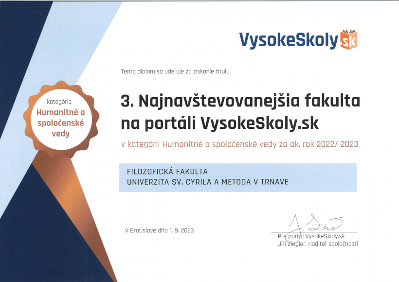 Filozofická fakulta Univerzity sv. Cyrila a Metoda v Trnave získala diplom za získanie titulu 3. najnavštevovanejšej fakulty na portáli VysokeSkoly.sk v kategórií Humanitné a spoločenské vedy za akademický rok 2022/2023.