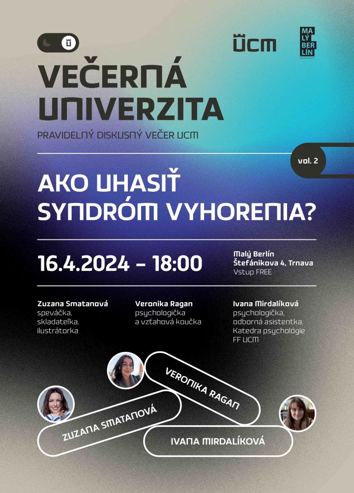 Témou druhej diskusie Večernej univerzity bude syndróm vyhorenia, ktorý je v súčasnom rýchlom svete orientovanom na výkon veľmi častý, no napriek tomu stále málo komunikovaný. Sprevádzajú ho stavy fyzického, emocionálneho a duševného vyčerpania, ktoré znižujú produktivitu a spôsobujú beznádej či bezmocnosť. O tom, čo vlastne vyhorenie je, ako ho identifikovať, aké sú jeho dopady na psychické zdravie a čo môžeme robiť, ak už ním trpíme, budú diskutovať doktorka Ivana Mirdalíková z Katedry psychológie Filozofickej fakulty UCM, psychologička a vzťahová koučka Veronika Ragan a speváčka a skladateľka Zuzana Smatanová.
