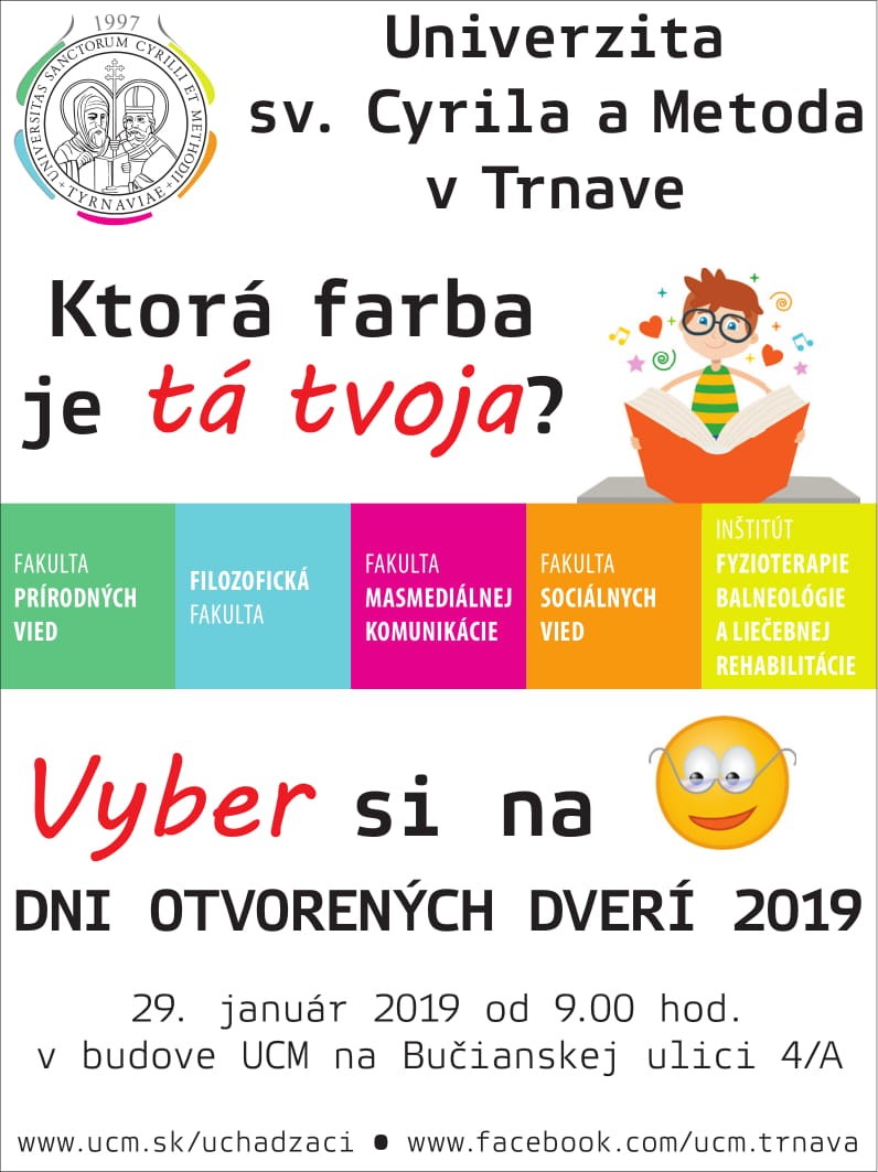 Dňa 29. 01. 2019 (utorok) od 9.00 hod. do 14.00 hod. sa v priestoroch UCM, Bučianska ulica 4/A v Trnave, uskutoční Deň otvorených dverí UCM. Viac informácií nájdete tu.