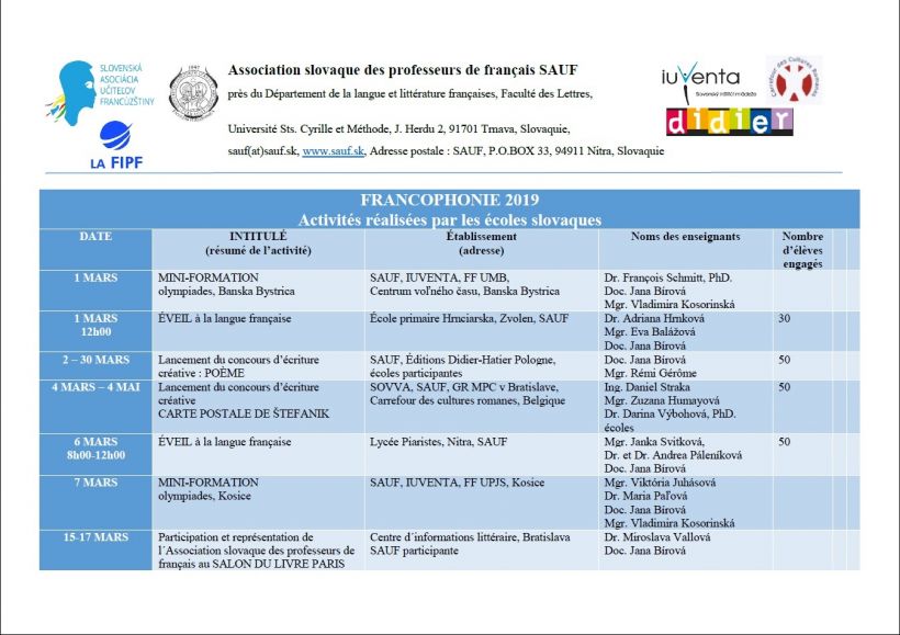 Slovenská asociácia učiteľov francúzštiny sídliaca pri Oddelení francúzskeho jazyka a literatúry FF UCM a sieť škôl, v ktorých sa vyučuje francúzsky jazyk vás pozývajú v mesiaci marec 2019 na podujatia týkajúce sa kultúr a jazyka francúzsky hovoriacich krajín. Program je vo francúzštine.