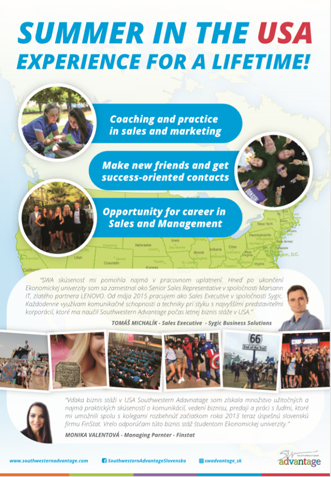 Dňa 27. 3. 2019 sa o 14.00 hod. a 16.00 hod. v miestnosti S 0.2 uskutoční informačný deň k ponuke letnej stáže v Amerike. Okrem toho sa tiež bude konať 1. 4. 2019 prednáška s prezidentom Southwestern Advantage company Danom Moorom, na ktorú ste všetci srdečne vítaní. Viac informácií o prednáške na FB: https://www.facebook.com/events/556220158201180/