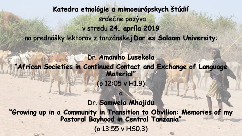 Katedra etnológie a mimoeurópskych štúdií srdečne pozýva na prednášky lektorov z tanzánskej Dar es Salaam University, ktoré sa uskutočnia dňa 24. 4. 2019.