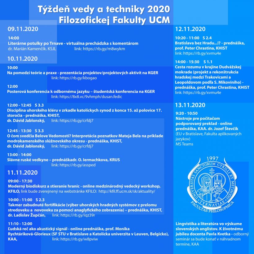 Oznamujeme študentom, že v dňoch 9. 11. - 13. 11. 2020 sa uskutoční online Týždeň vedy a techniky 2020 na FF UCM.