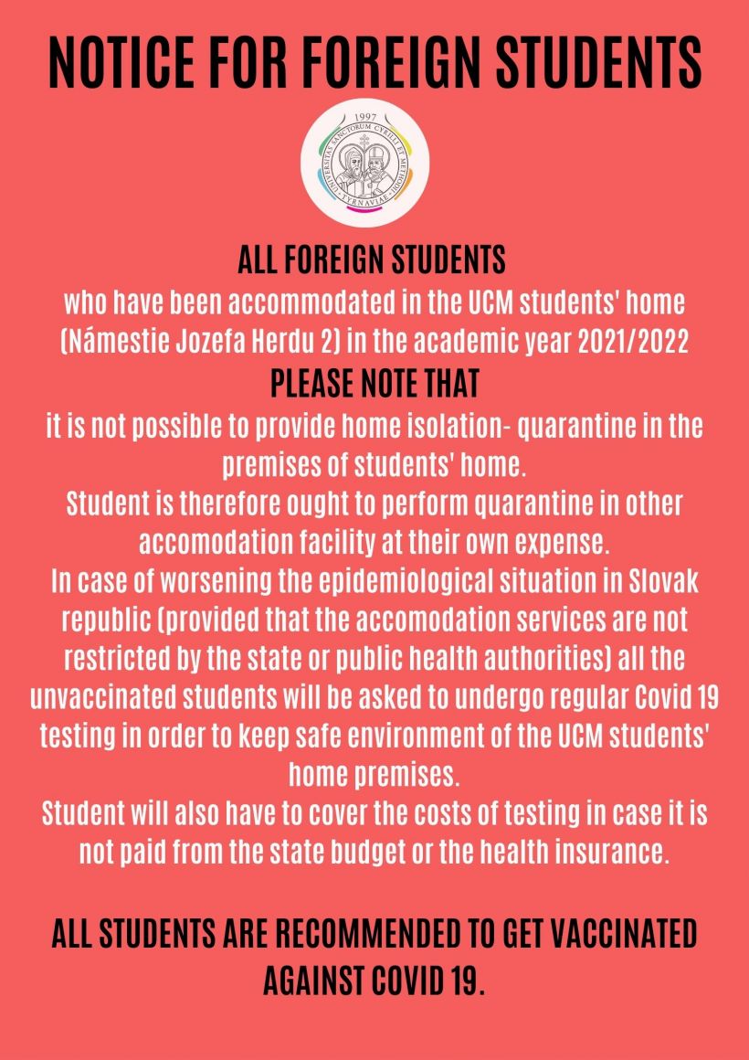 All foreign students who have been accommodated in the UCM student´s home (Námestie J. Herdu) in the academic year 2021/2022, please read the following information about the conditions of the accommodation.