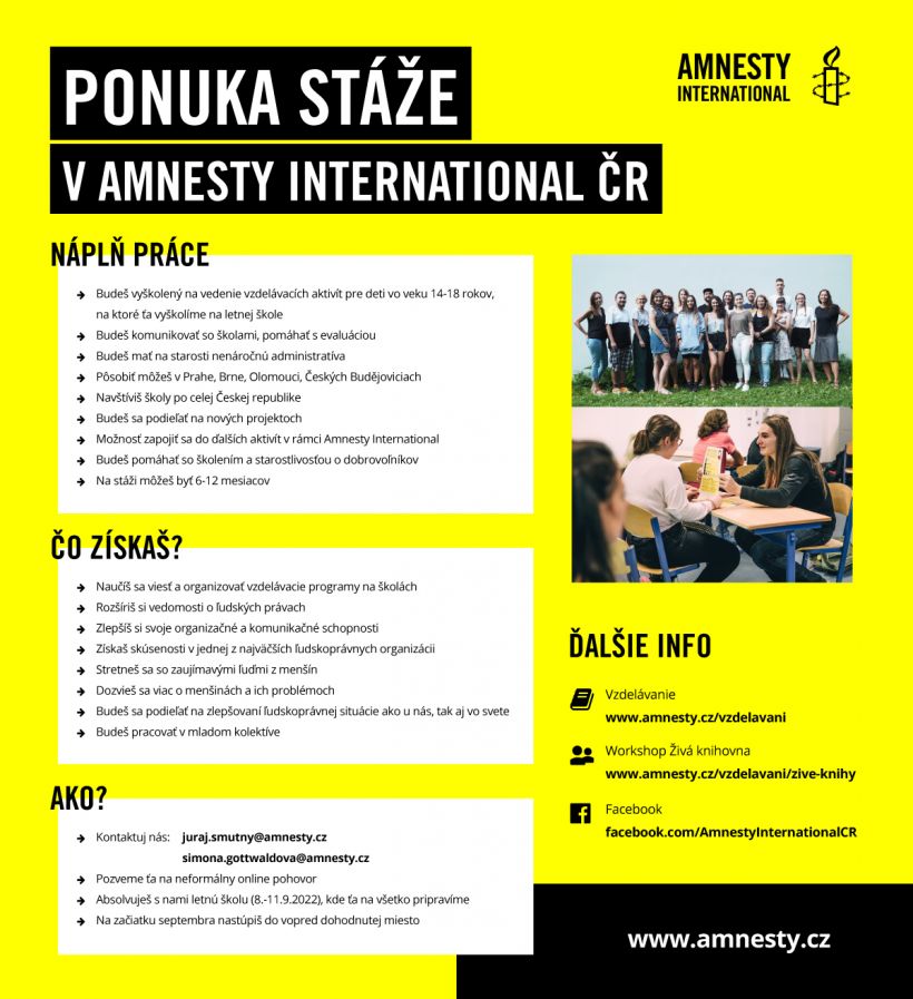 Ahoj, som Juraj a som stážista v neziskovej organizácii Amnesty International ČR. Chcel by som Ti ponúknuť možnosť stať sa členom/členkou českého tímu Amnesty International; teda spoznať nových ľudí, zorientovať sa v ľudskoprávnej problematike, precestovať Českú republiku a nabrať potrebnú prax pred ukončením štúdia. Tvoja stáž by prebiehala na oddelení ľudskoprávneho vzdelávania, a to buď v Prahe alebo v Brne. Keďže ide o zahraničnú stáž, je možné ju absolvovať v rámci programu Erasmus+ (informácie o aktuálnych výzvach nájdeš na stránke Filozofickej fakulty UCM), a to ako v rámci štúdia, tak aj ako absolventskú stáž.