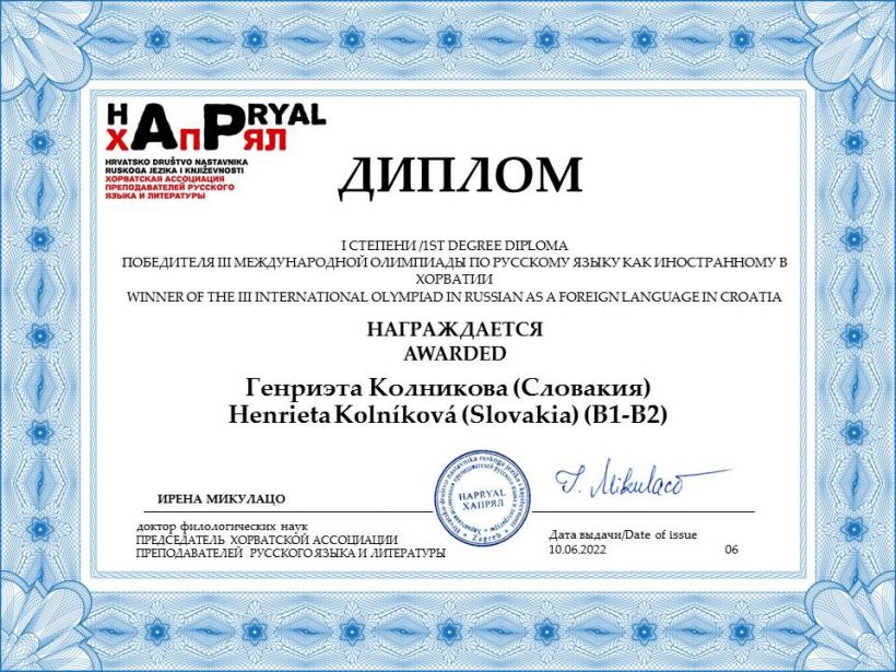 Tretí ročník medzinárodnej olympiády z ruského jazyka, ktorý organizovala naša partnerská Univerzita Jurija Dobrilu v Pule, sa konal 10. júna 2022 a zúčastnili sa ho študenti zo 4 kontinentov a 18 krajín sveta. Poslucháčka 2. ročníka bakalárskeho stupňa štúdia na Katedre rusistiky FF UCM v Trnave, Henrieta Kolníková, vyhrala prvé miesto, k čomu jej srdečne blahoželáme a prajeme veľa ďalších úspechov.