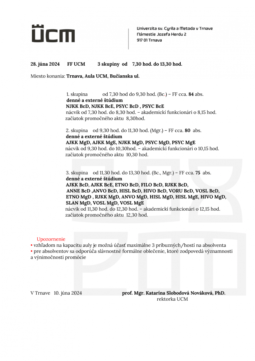 Harmonogram slávnostných promócií absolventiek a absolventov Filozofickej fakulty UCM v Trnave
