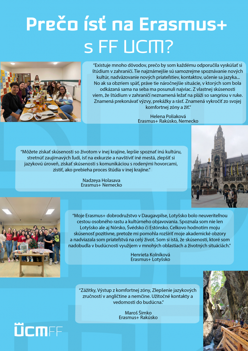 Oddelenie medzinárodných vzťahov UCM v spolupráci s Filozofickou fakultou vyhlasuje výzvu na podávanie prihlášok na Erasmus+ mobility v budúcom akademickom roku 2025/2026.
