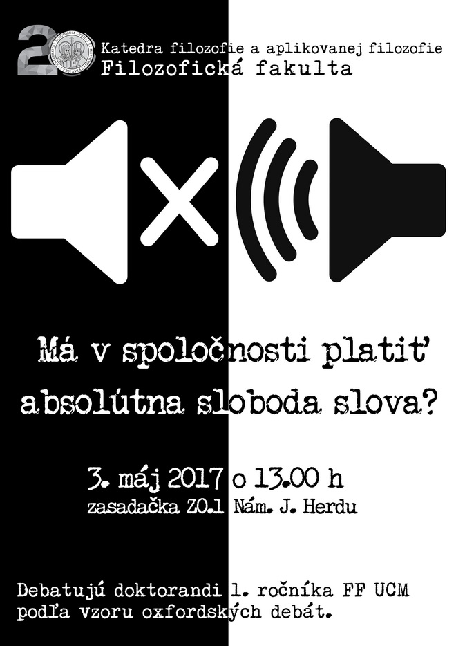 Katedra filozofie a aplikovanej filozofie Filozofickej fakulty UCM v Trnave Vás srdečne pozýva na diskusiu podľa vzoru oxfordských debát na tému: Má v spoločnosti platiť absolútna sloboda slova? Podujatie sa koná 3. mája 2017 o 13.00 hod. v zasadačke Z0.1 na prízemí budovy UCM na Nám. J. Herdu 2 v Trnave.