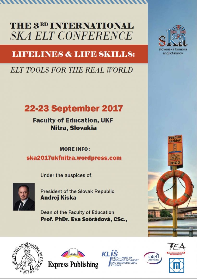 Slovenská komora angličtinárov (SKA) srdečne pozýva na každoročnú konferenciu pre učiteľov angličtiny Lifelines and Life Skills, ktorá sa uskutoční v Nitre v dňoch 22. - 23. 09. 2017.