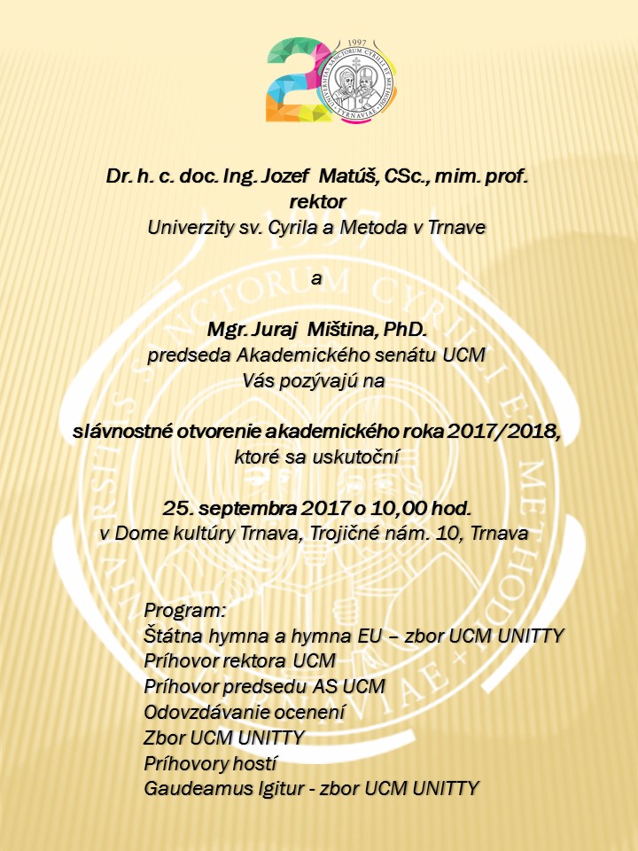 Pozývame Vás na slávnostné otvorenie akademického roka 2017/2018, ktoré sa uskutoční 25. septembra 2017 o 10.00 hod. v Dome kultúry Trnava, Trojičné námestie 10, Trnava.