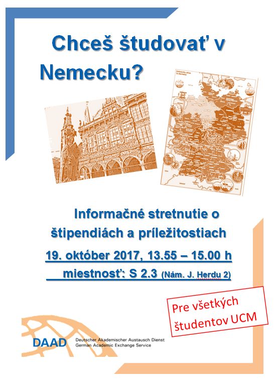 Katedra germanistiky FF UCM v Trnave organizuje informačné stretnutie o štipendiách dňa 19. októbra o 13.55 hod. v miestnosti S 2.3 (Nám. J. Herdu 2).