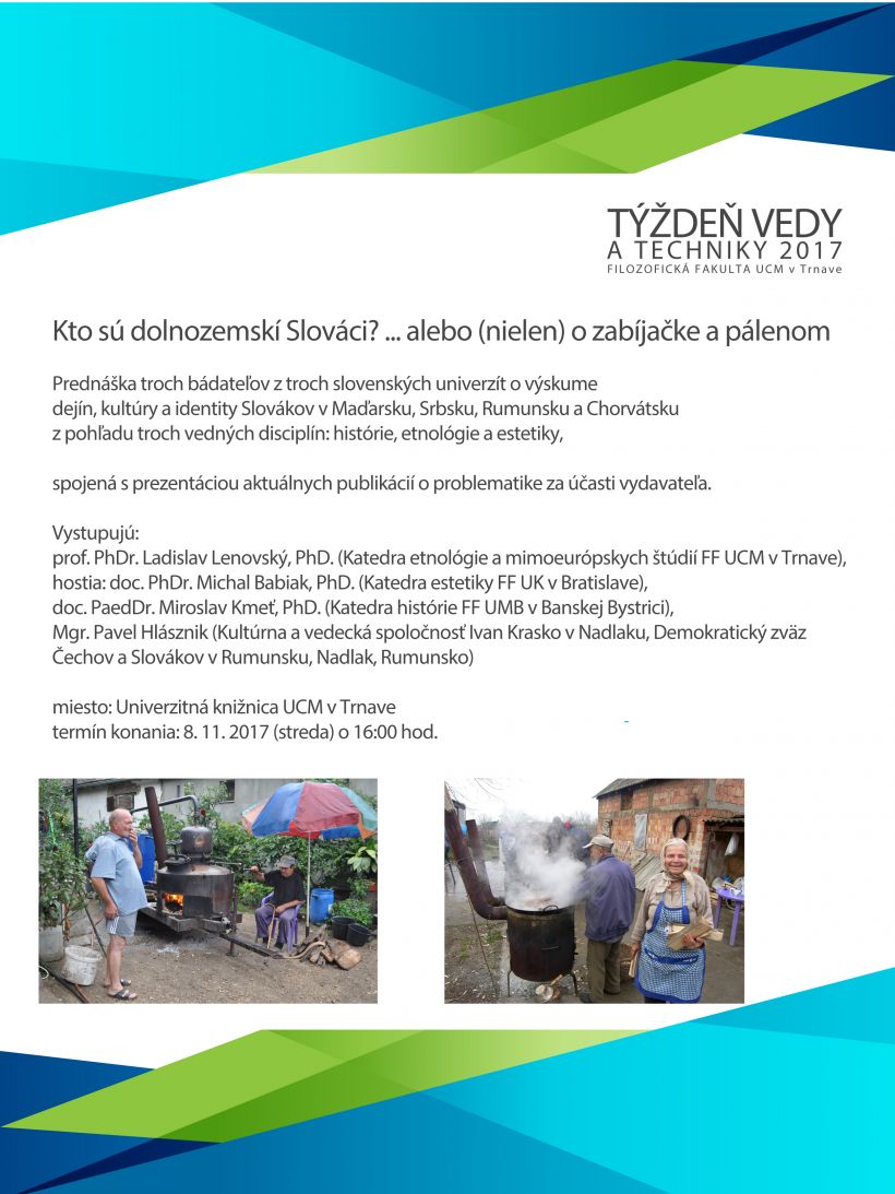 Pozývame na prednášku troch bádateľov z troch slovenských univerzít o výskume dejín, kultúry a identity Slovákov v Maďarsku, Srbsku, Rumunsku a Chorvátsku z pohľadu troch vedných disciplín: histórie, etnológie a estetiky, spojenú s prezentáciou aktuálnych publikácií o problematike za účasti vydavateľa.