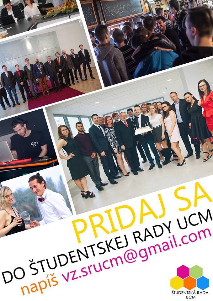 Študentská rada UCM opäť robí nábor nových členov pred začiatkom akademického roka. Ak chceš byť súčasťou nášho tímu a tvoriť študentský život na našej univerzite, neváhaj a pridaj sa k nám! Vyplň dotazník https://goo.gl/k6zs7J alebo nám napíš na vz.srucm(zav.)gmail.com.