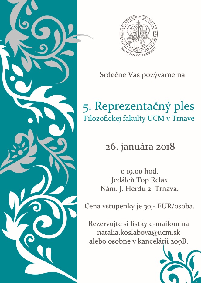 Srdečne pozývame všetkých zamestnancov, študentov a priateľov na 5. reprezentačný ples Filozofickej fakulty UCM v Trnave, ktorý sa bude konať dňa 26. 1. 2018 o 19.00 hod. v jedálni UCM – Top Relax, Nám. J. Herdu 2.