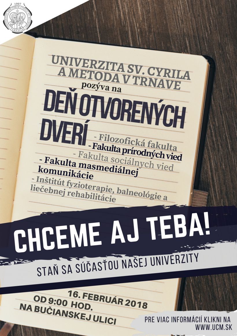Univerzita sv. Cyrila a Metoda v Trnave srdečne pozýva všetkých študentov, učiteľov, priateľov a známych na Deň otvorených dverí, ktorý sa bude konať dňa 16. 2. 2018 od 9.00 hod. v priestoroch auly na Bučianskej ulici.