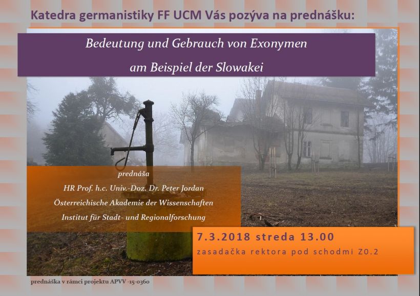 Katedra germanistiky FF UCM Vás pozýva na prednášku Bedeutung und Gebrauch von Exonymen am Beispiel der Slowakei, ktorá sa uskutoční dňa 7. 3. 2018 o 13.00 hod. v zasadačke rektora Z0.2.