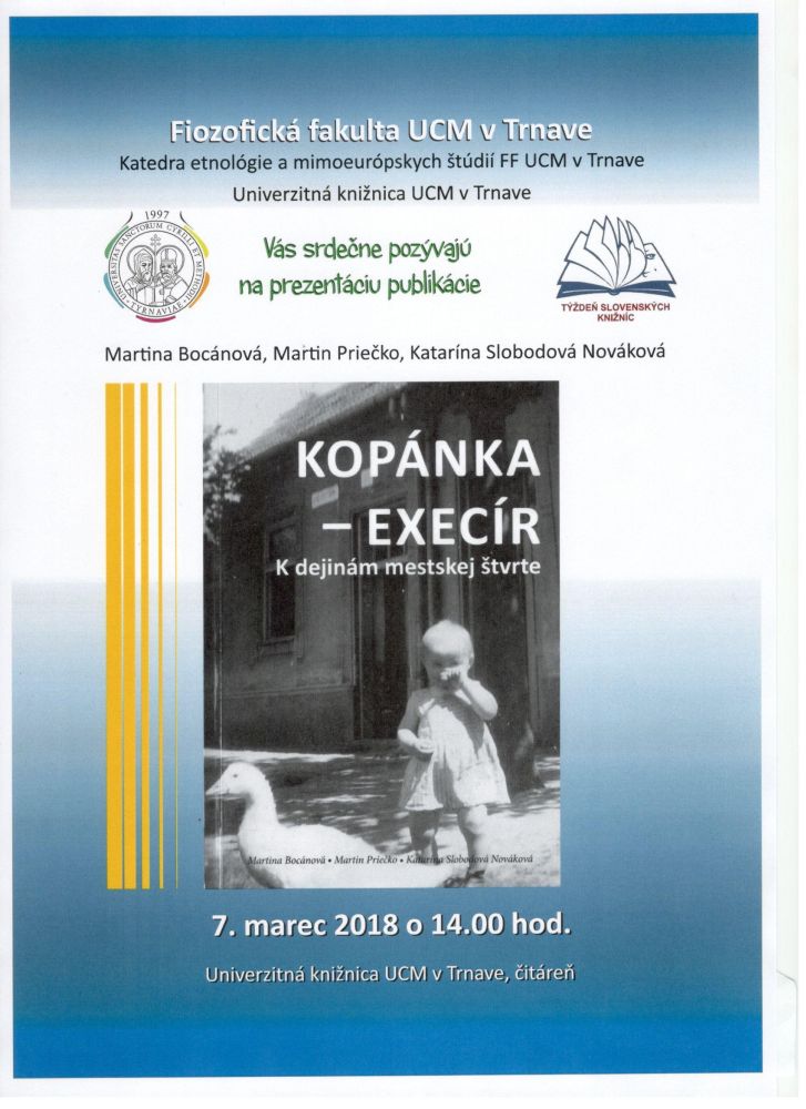 Katedra etnológie a mimoeurópskych štúdií FF UCM v Trnave a Univerzitná knižnica UCM v Trnave Vás srdečne pozývajú na prezetáciu publikácie Kopánka - Execír. K dejinám mestskej štvrte, ktorá sa uskutoční 7. marca 2018 o 14.00 hod. v čitárni Univerzitnej knižnice UCM v Trnave.