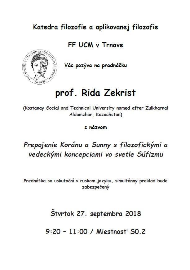 Katedra filozofie a aplikovanej filozofie FF UCM pozýva na prednášku prof. Rida Zekrist s názvom Prepojenie Koránu a Sunny s filozofickými a vedeckými koncepciami vo svetle Súfizmu, ktorá sa uskutoční dňa 27. 09. 2018 o 9.20 hod. v miestnosti S0.2.