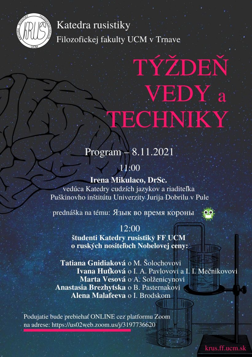 Oznamujeme študentom, že v týždni 08. 11. - 14. 11. 2021 sa uskutoční online Týždeň vedy a techniky 2021 na FF UCM.