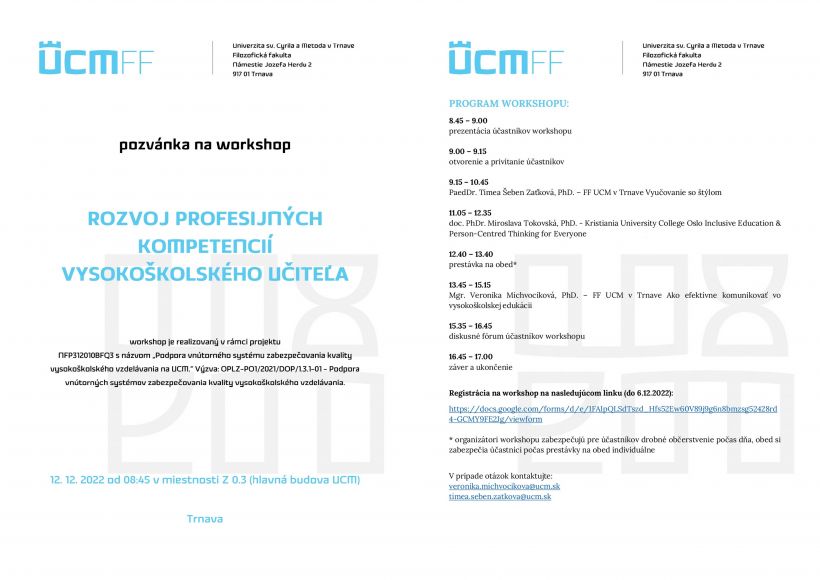 Workshop sa uskutoční dňa 12.12.2022 so začiatkom o 8.45 h v miestnosti Z 0.3 v budove UCM (nám. J. Herdu 2, Trnava). Blok, ktorý bude realizovať doc. PhDr. Miroslava Tokovská, Ph.D. z Kristiania University College Oslo sa bude realizovať v slovenskom jazyku.