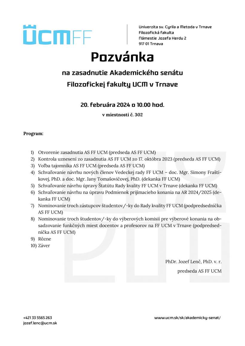dňa 20. februára 2024 o 10.00 hod. sa uskutoční zasadnutie Akademického senátu Filozofickej fakulty UCM v Trnave v miestnosti č. 302 v hlavnej budove UCM v Trnave.