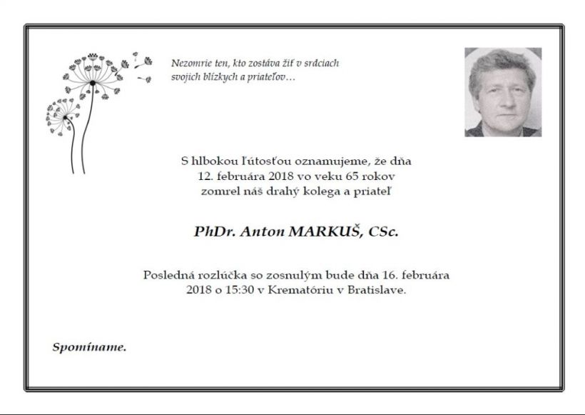 S hlbokou ľútosťou oznamujeme, že dňa 12. 2. 2018 zomrel náš drahý kolega a priateľ PhDr. Anton Markuš, CSc., ktorý bol prvým vedúcim Katedry psychológie FF UCM. Posledná rozlúčka so zosnulým bude dňa 16. 2. 2018 o 15.30 v Krematóriu v Bratislave.