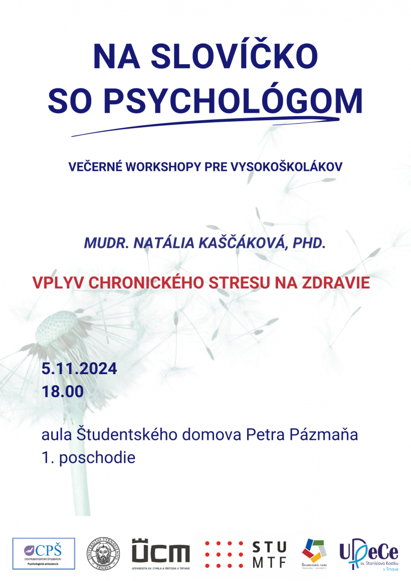 01.11.2024 NA SLOVÍČKO SO PSYCHOLÓGOM - Večerné workshopy pre vysokoškolákov - Vplyv chronického stresu na zdravie . Vložil: Lukáš Kurajda Zodpovedná osoba: PhDr. Jana Hubinská, PhD. Zdroj: Katedra psychológie FF UCM