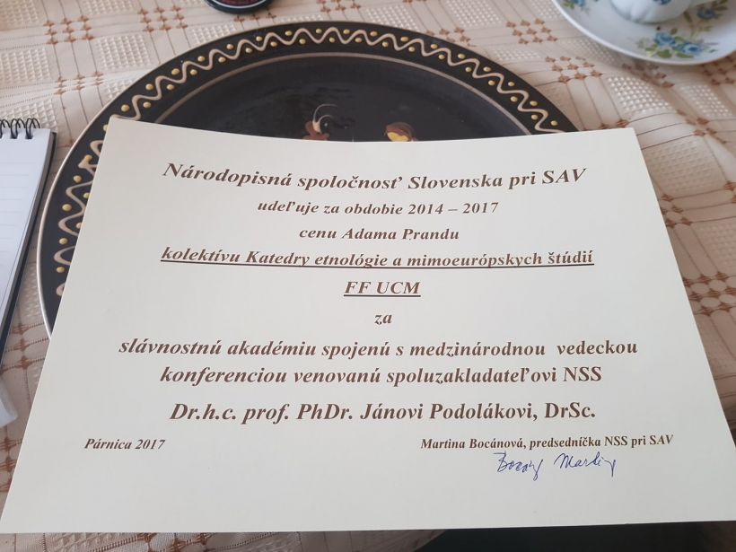 Tešíme sa z ceny Adama Prandu od Národopisnej spoločnosti Slovenska pri SAV, ktorú získal kolektív Katedry etnológie a mimoeurópskych štúdií FF UCM, za Slávnostnú akadémiu spojenú s medzinárodnou vedeckou konferenciou venovanou spoluzakladateľovi NSS Dr.h.c. prof. PhDr. Jánovi Podolákovi, DrSc.